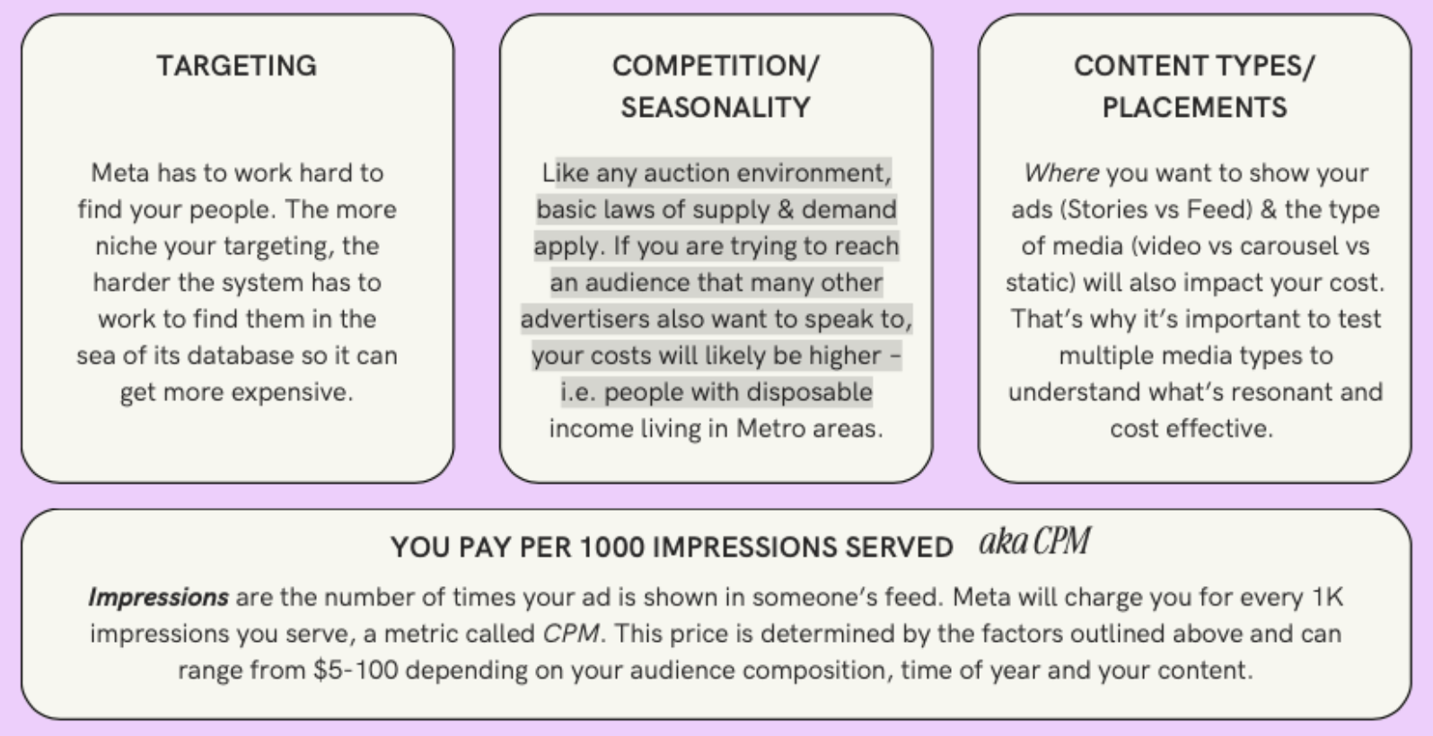 The cost of running ads on Meta (IG and FB) is determined by an auction system, based on three categories.